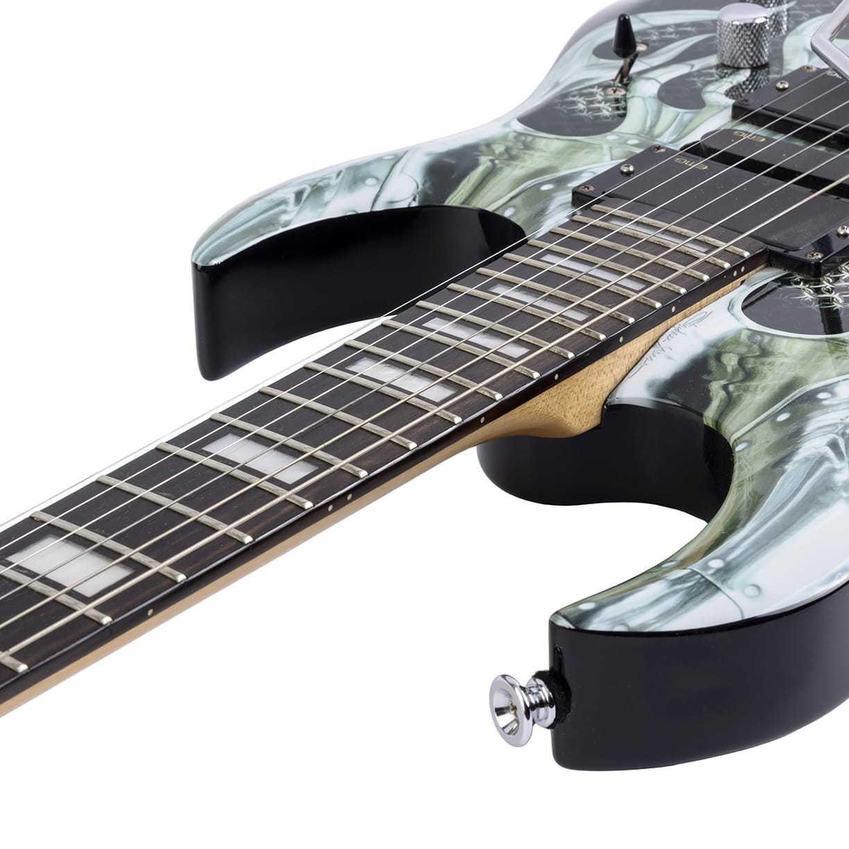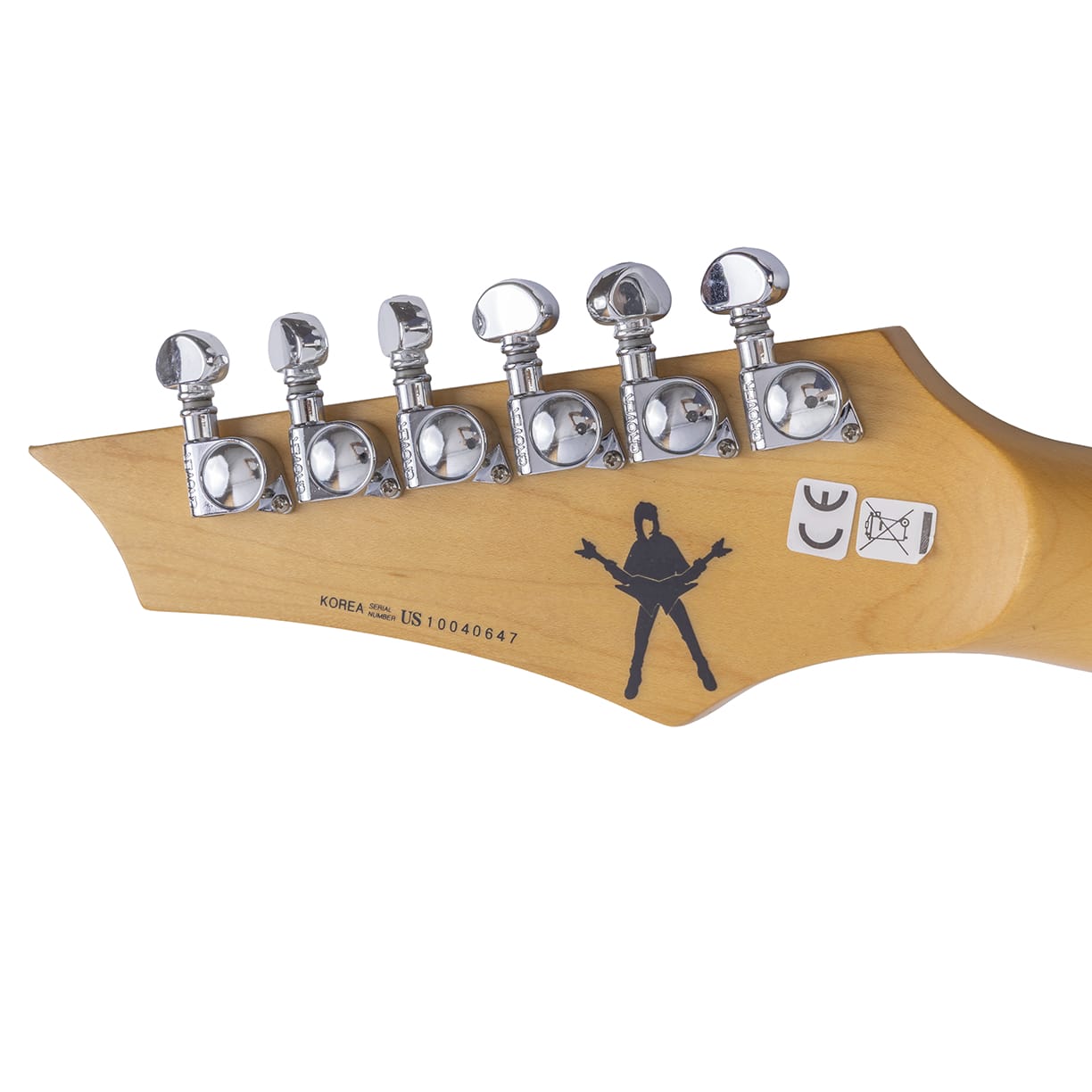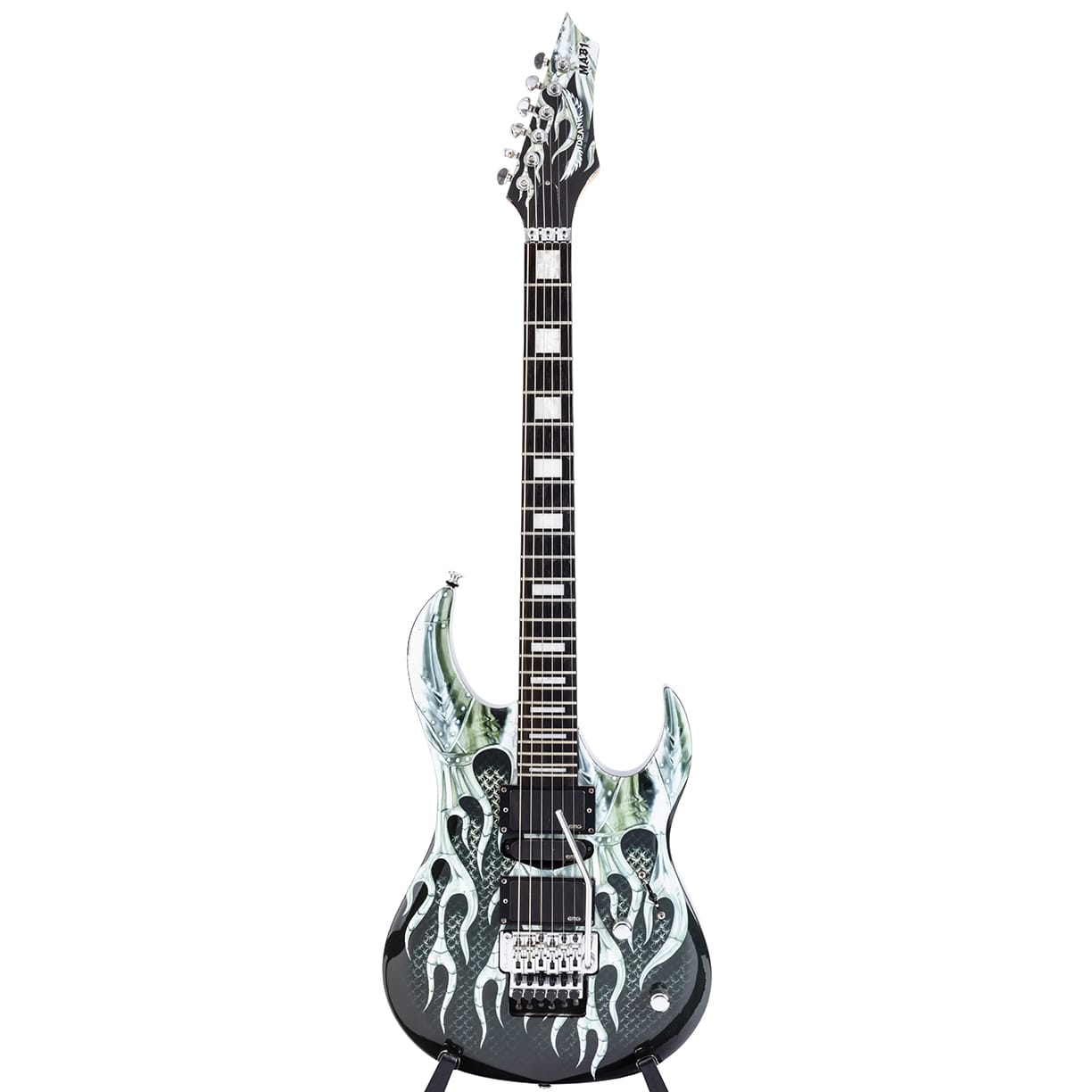 Die Dean Michael Angelo Batio Armored Flame E-Gitarre wurde von Batio als unglaublich schnelle Gitarre mitentwickelt. Der schön schlanke, leicht abgerundete Hals ist sehr komfortabel und schließt für eine erweiterte Spielbarkeit in einem geraden Winkel an den Korpus an. Es hat ein Griffbrett aus Ebenholz und Blockeinlagen, die auf der Bühne leicht zu erkennen sind. Der Korpus aus Erle hat einen doppelten Cutaway mit abgeschrägten Kanten und ist mit einem speziellen „Armored Flame“-Finish überzogen. Diese Signature-Gitarre ist mit aktiven EMG-Tonabnehmern bestückt und verfügt über eine Floyd Rose Original-Tremolo-Brücke, Nickel-Hardware und Grover-Tuner.