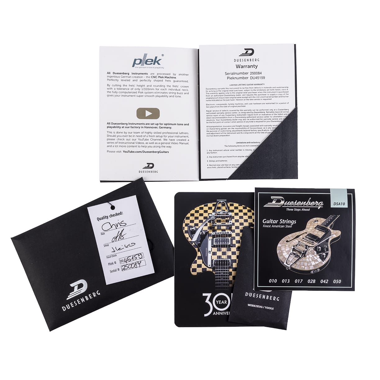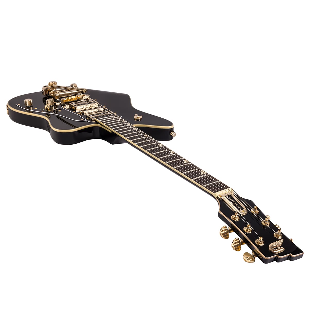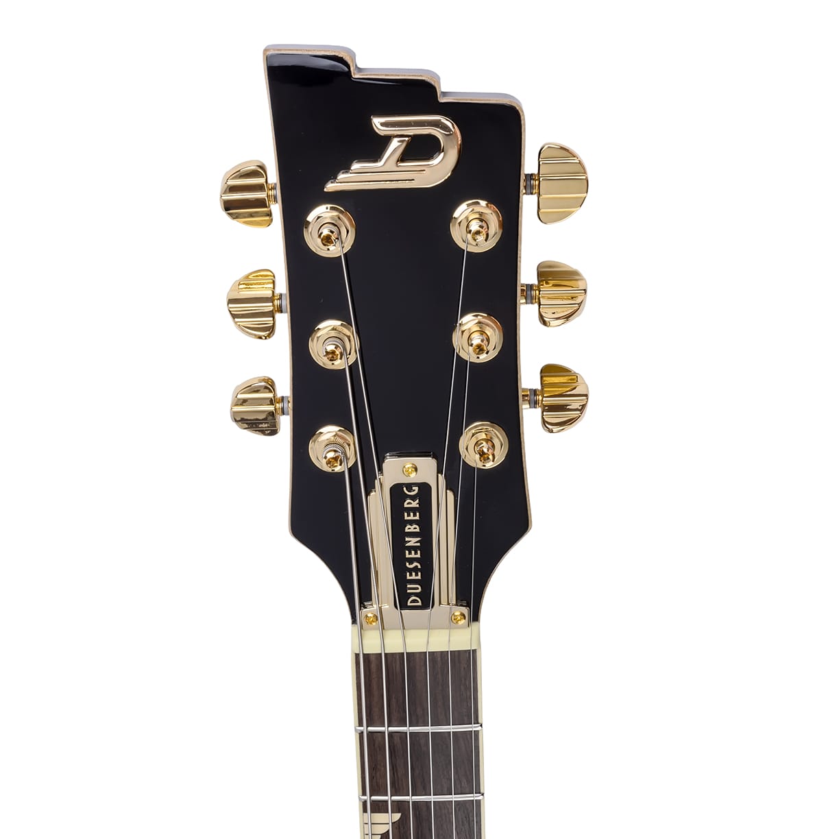 Abgerundet wird das Ganze durch das zuverlässige Diamond Deluxe Tremola, exklusive Duesenberg Wing Griffbretteinlagen, durchgängig goldene Hardware und eine elegant geformte Korpuskontur.