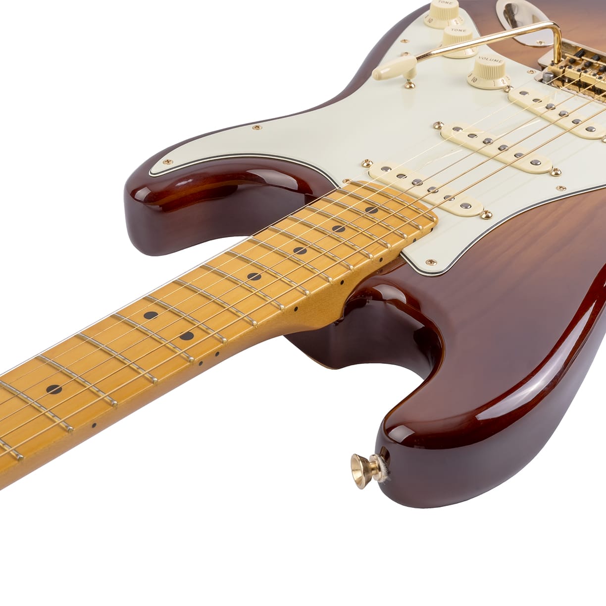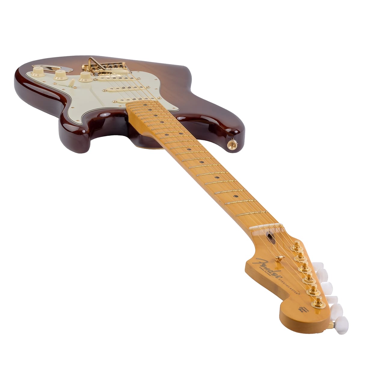 Zum 75. Jubiläum des 1946 von Leo Fender gegründeten Traditionsunternehmens präsentiert Fender USA die Fender 75th Anniversary Commemorative Stratocaster. Das limitierte Sondermodell aus dieser Serie bietet einzigartige Merkmale, die speziell Fans, Sammlern und Liebhabern der ikonischen Instrumente zusagen dürften. Natürlich bewegt sich die Ausstattung der 75th Anniversary Commemorative Stratocaster auf Premium-Niveau und bietet drei Custom Shop Fat ’60s Single Coils, die die gesamte Klangpalette der legendären Sixties-Strat auszuspielen wissen. Der einteilige Hals aus Ahorn mit Deep-‚C‘ Profil und Super Natural Finish auf der Halsrückseite fühlt sich sehr gut an und ist traumhaft zu spielen. Zu den besonderen Features des 75th Anniversary Run zählt ein eigens für die Serie entwickeltes 2-Color Bourbon Burst Finish, die zum Anlass gravierte Neckplate und ein 75th Anniversary Ingot auf der Rückseite der Kopfplatte.