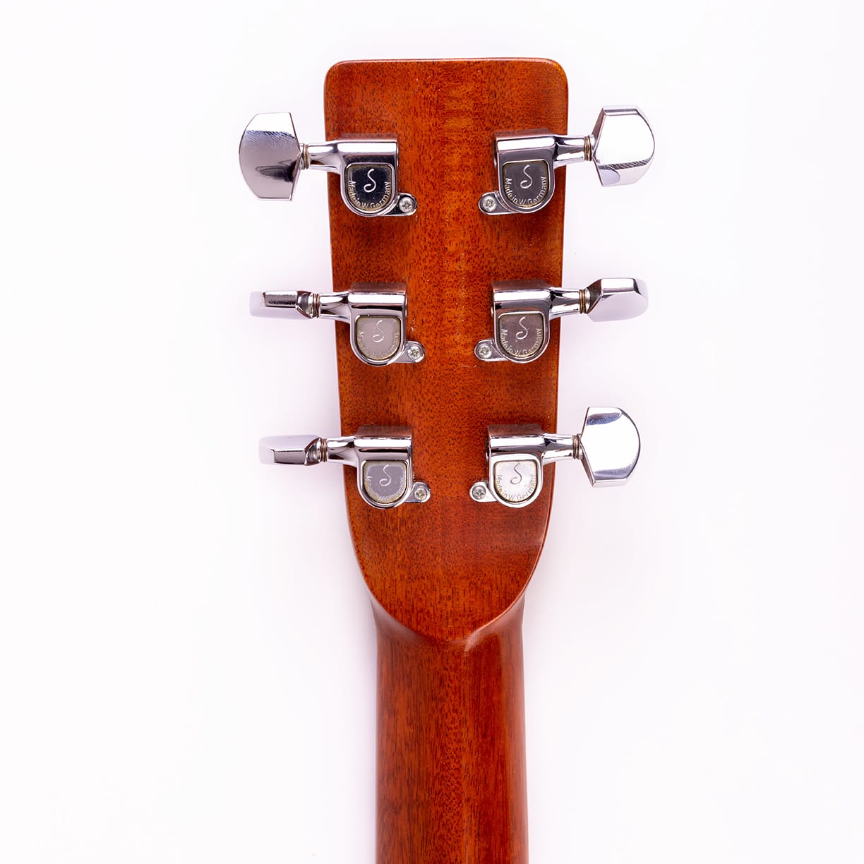 Sie hat eine solide Zederndecke, einen 3-teiligen Rücken und Zargen aus indischem Palisander. Das Binding ist aus Walnuss. Der einteilige, V-förmige Hals ist aus Honduras-Mahagoni. Das Ebenholz Griffbrett hat rautenförmige Perlmutt Markierungen.