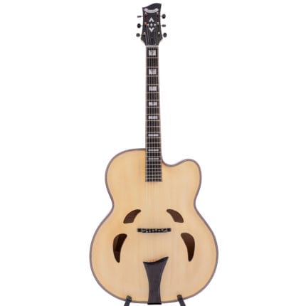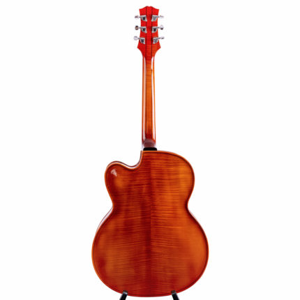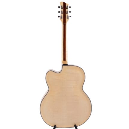 Materialien: Handgeschnitzte Decke aus massiver Fichte; Hals aus massivem Mahagoni, Boden aus massivem Riegelahorn, Zargen aus massivem Ahorn, Griffbrett aus massivem brasilianischem Palisander mit Fächereinlage aus Perlmutt; Kopfeinlage „Vase und Schnörkel“; Griffbrett, Kopfplatte und Korpus gebunden.