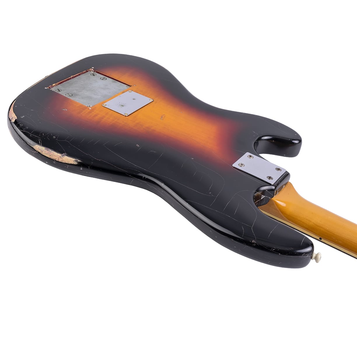 Die 3 tone sunburst Lackierung wurde nach vorsichtiger Entfernung der Überlackierung wieder sichtbar und nur aufpoliert. Sie hat deutliche Gebrauchsspuren, Dings und Dongs und weist Lackrisse auf. Die Bünde sind bespielt aber noch verwendbar. Saitenlage ist gut. Der Fuzz funktioniert. Sattel wurde vom Gitarrenbauer erneuert. Alle Elektronikteile bis auf Batterieanschlusskabel sind original belassen worden.