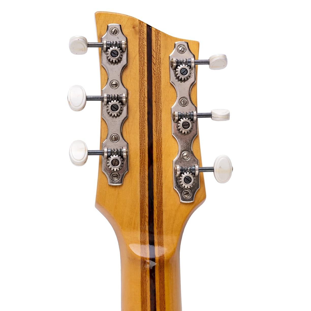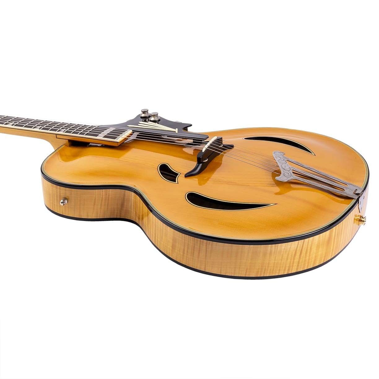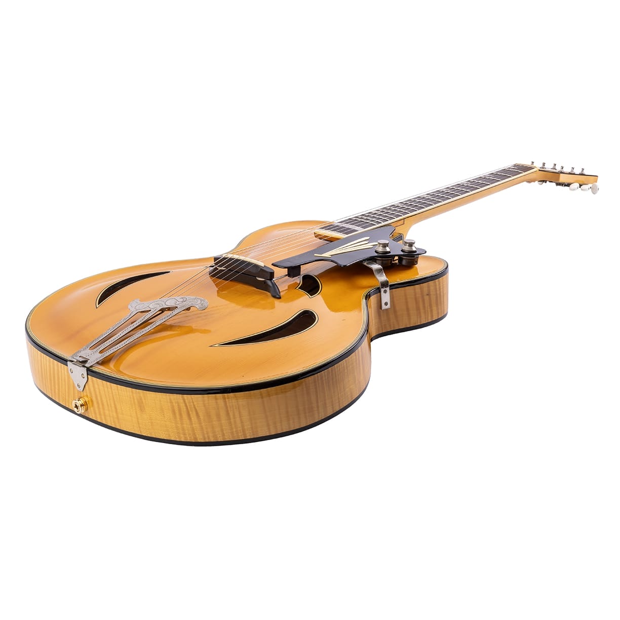 Die Gitarre mit den geteilten Schalllöchern wurde wunderbar restauriert. Der im Griffbrett eingebaute Rellog Tonabnehmer funktioniert gut. Die Elektronik wurde gereinigt und um einen modernen Input Jack mit Gurtpin erweitert. Die Anschlussbuchse im Hals wurde dabei erhalten und funktioniert ebenfalls.