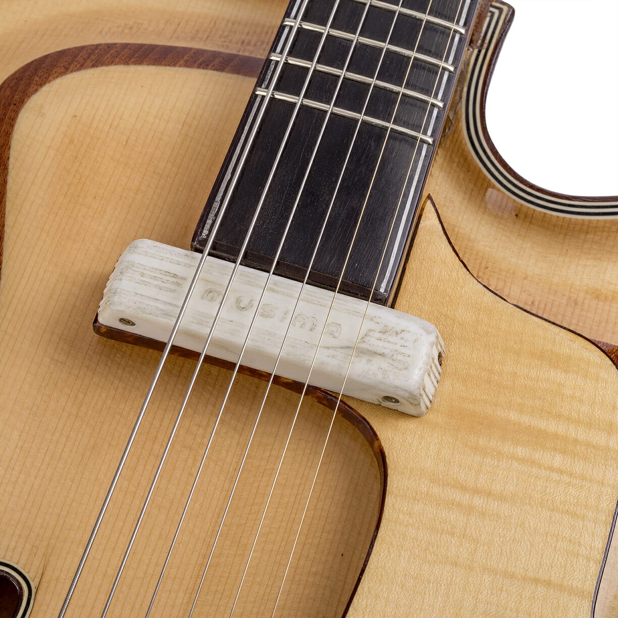 Bei dieser Gitarre ist das Pickguard aus Massivholz, die Rhomboid Einlagen im Ebenholzgriffbrett sind aus Zelluloid.