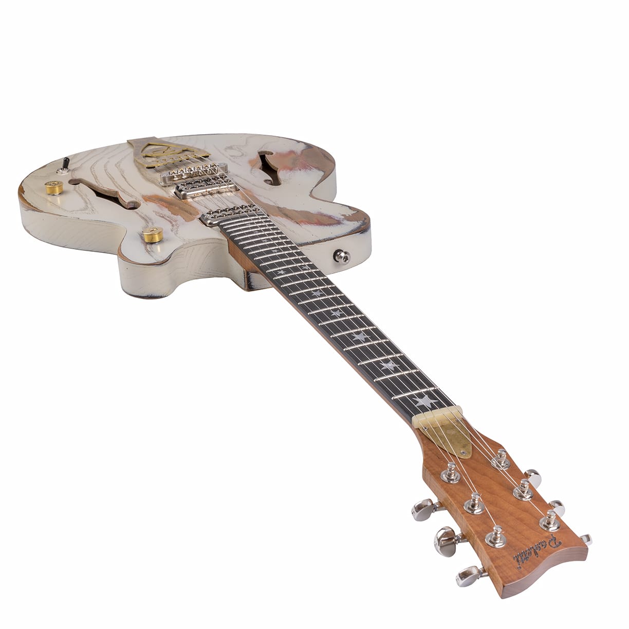 Hier bieten wir eine Paoletti 500 Lounge 2PSY an. Sie ist ausgestattet mit einem Hals aus geröstetem Ahorn und einem Griffbrett aus Ebenholz. Der neuen maßgeschneiderten Saitenhalter ist aus 100 % Messing. Alles im eigenen Haus hergestellt.