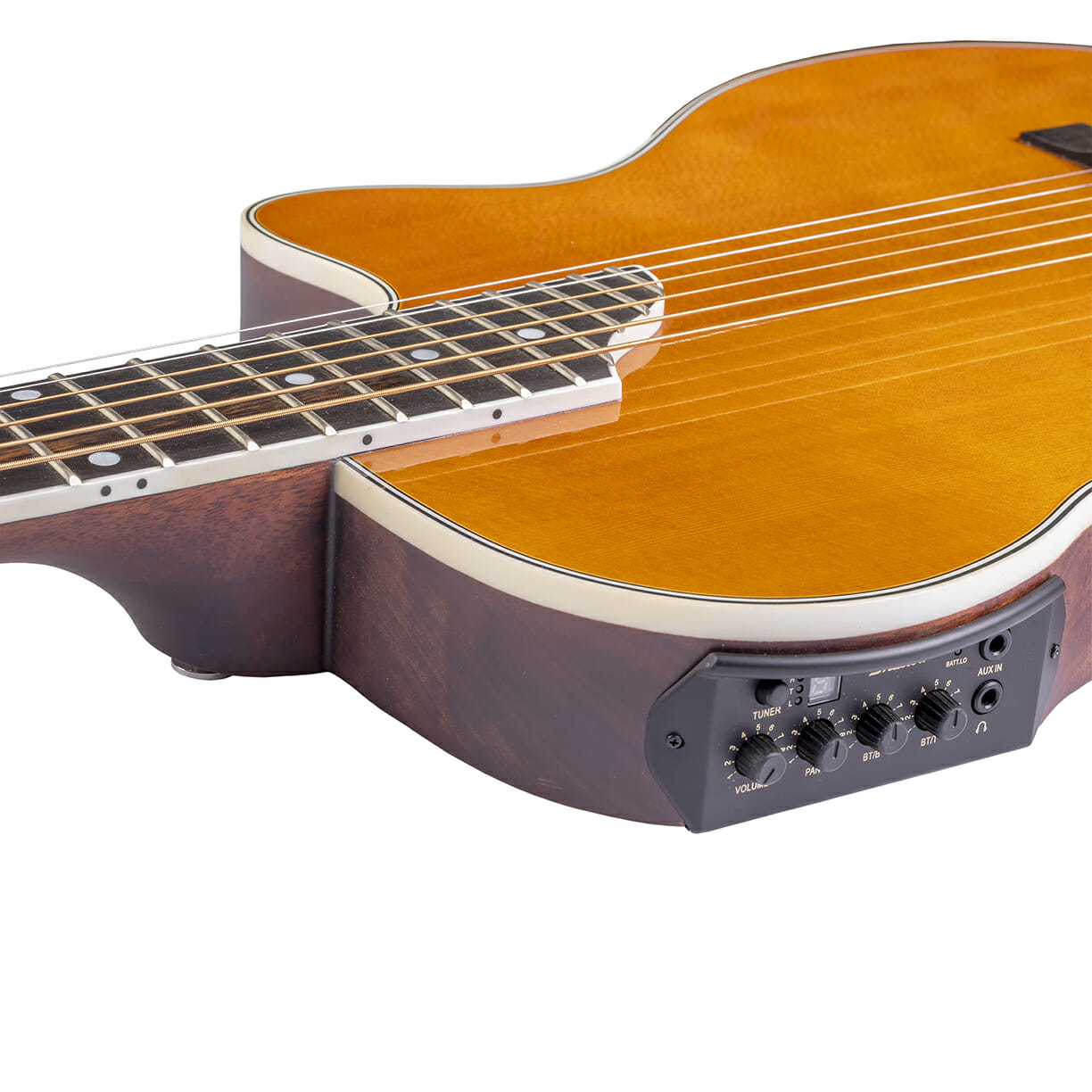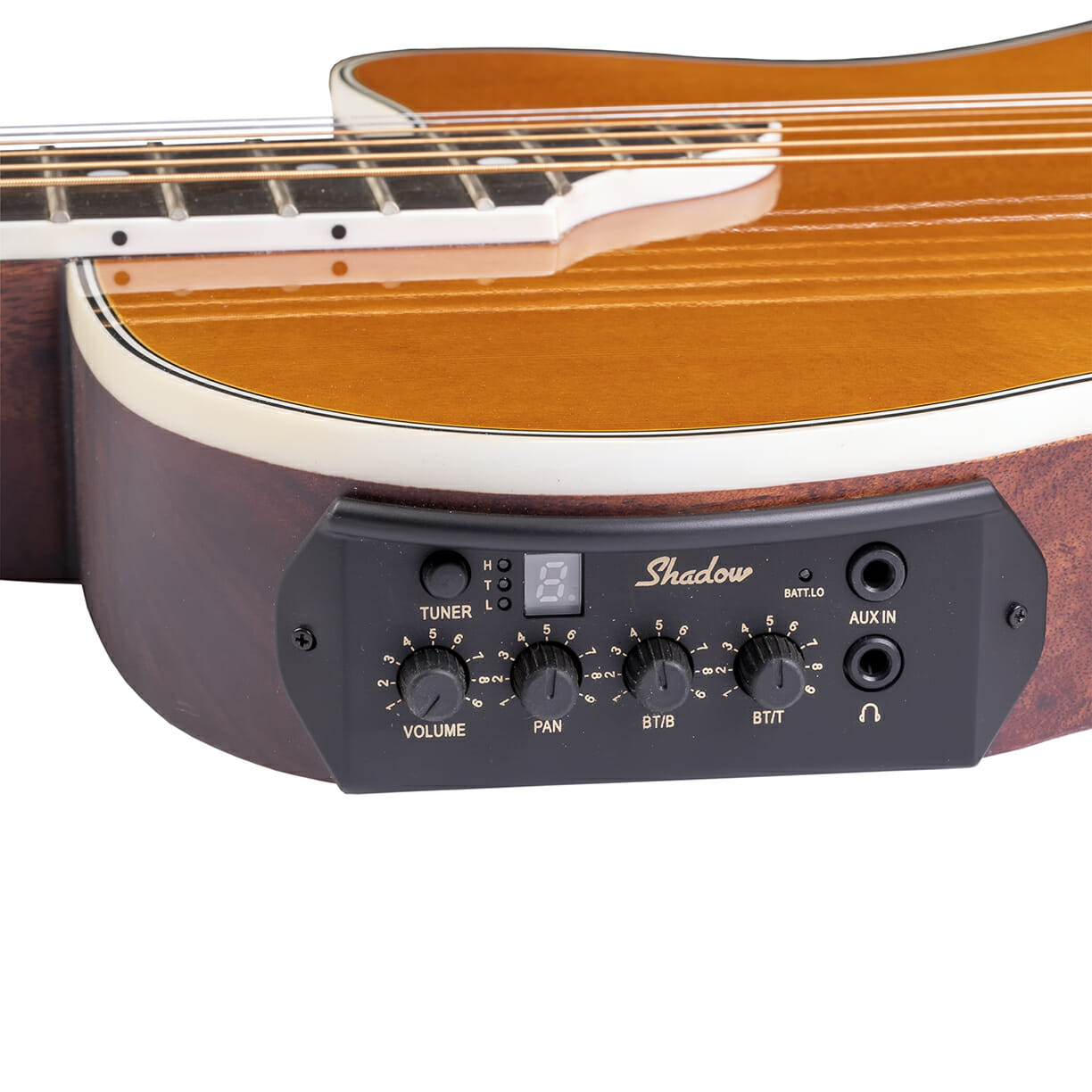 Tonabnehmersystem: Shadow mit Reglern für Volume, Pan, BT/B, BT/T; Tuner und Anschlüssen für Kopfhörer und AUX IN
